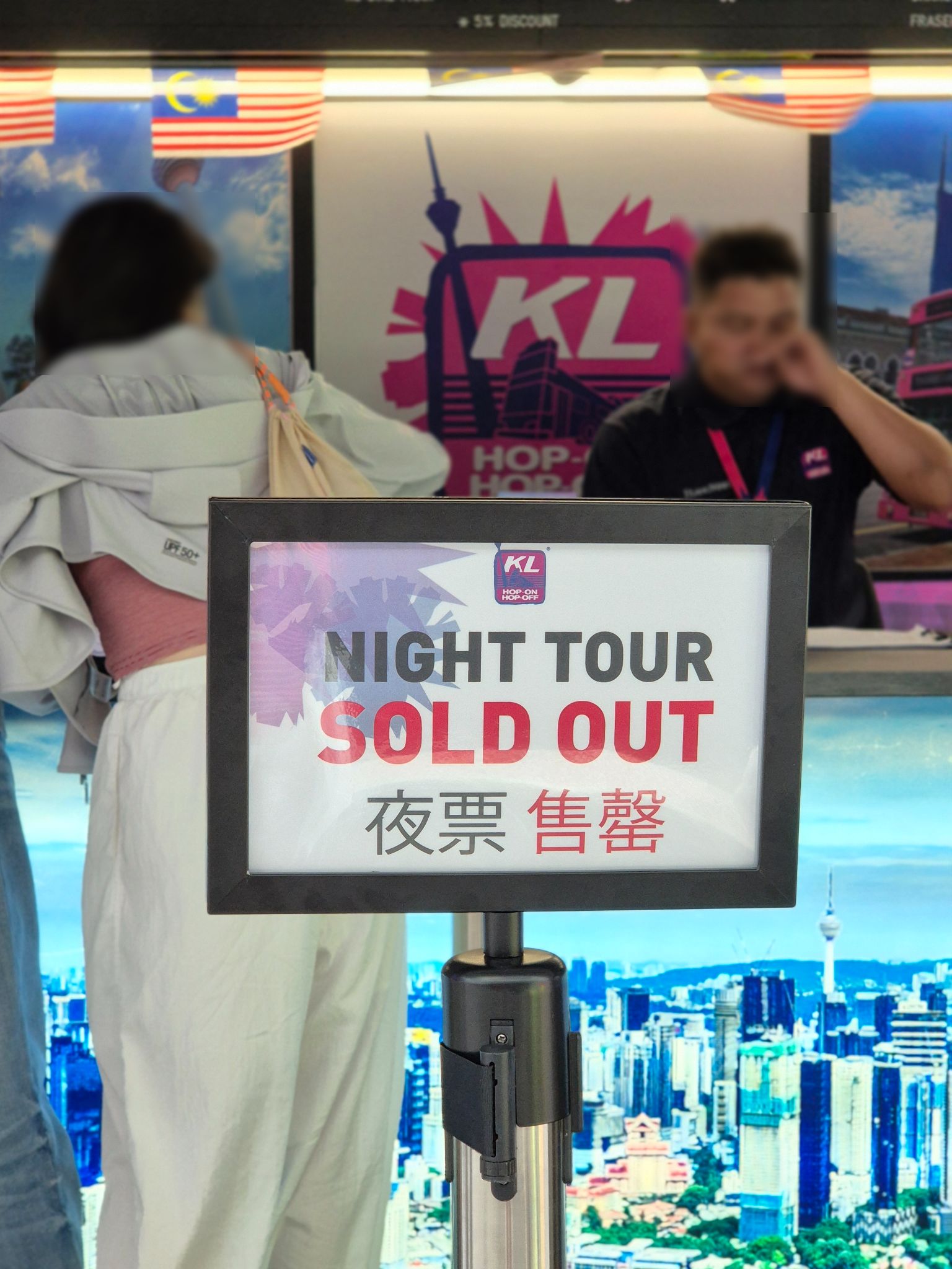 KL City of Lights 야간 시티 투어 버스는 8시 출발이지만, 그 전에 늦어도 오후 5시까지 클룩으로 구매한 티켓을 숭가이 왕(Sungei Wang) 플라자 앞 카운터에서 실물 티켓으로 교환해야 한다. 예전 블로그들 보면 줄에 맞춰서 2층 오픈탑에 태우는 것 같았는데, 이제는 그게 아니다. 가면 어떤 버스 어디에 탈 수 있는지 직원 분이 말씀해주신다. 카운터에 갔더니 역시 이날도 나이트 투어는 완판이었다.