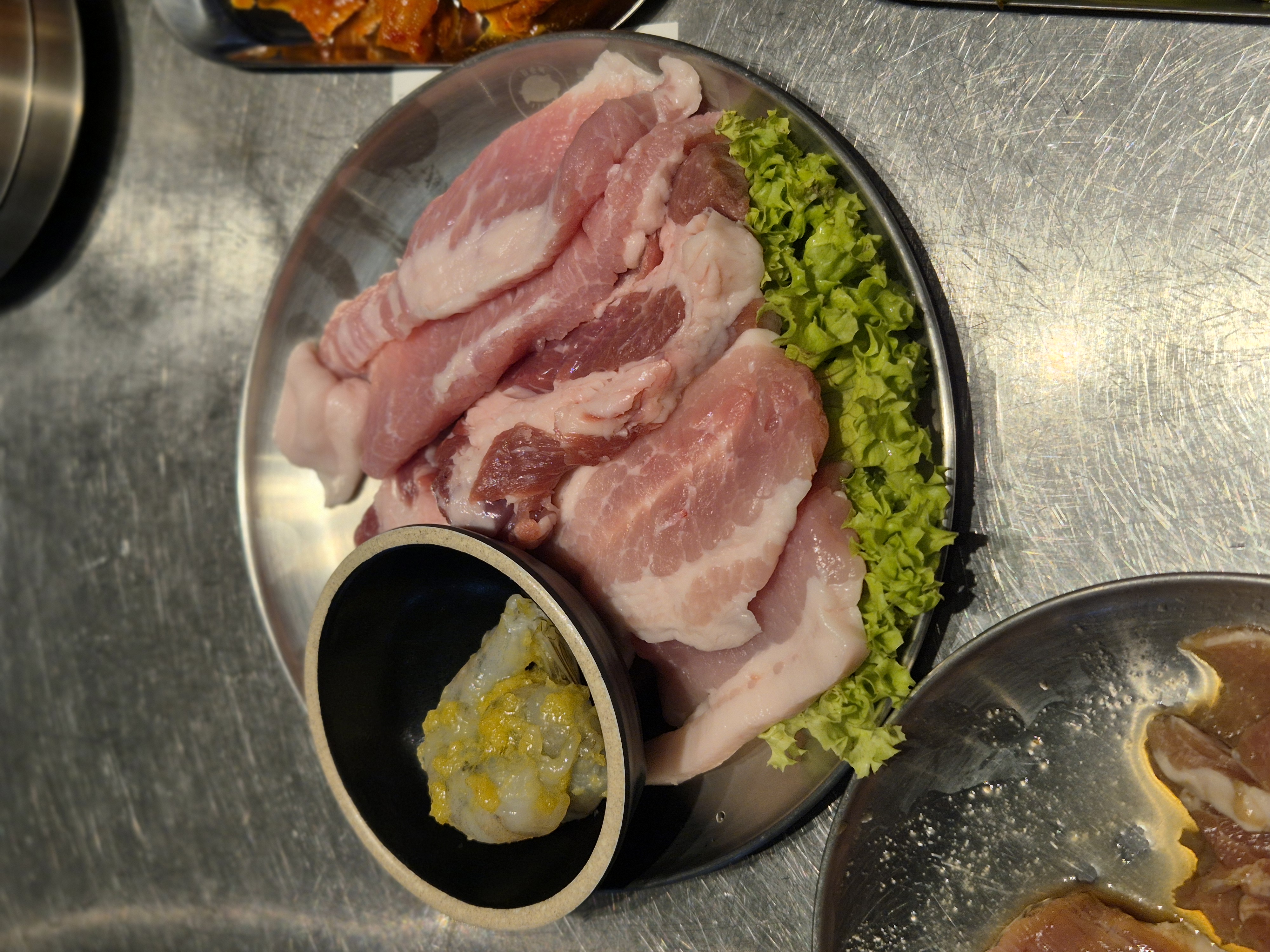 두 명이서 Premium Set를 시켰는데, 고기는 양념 목살, 목살, 항정살이 기본으로 나오고 삼겹살은 그냥 먹을지 양념할지 선택할 수 있었다. 이미 양념 목살이 있으니까 삼겹살은 그냥 기본으로 선택!