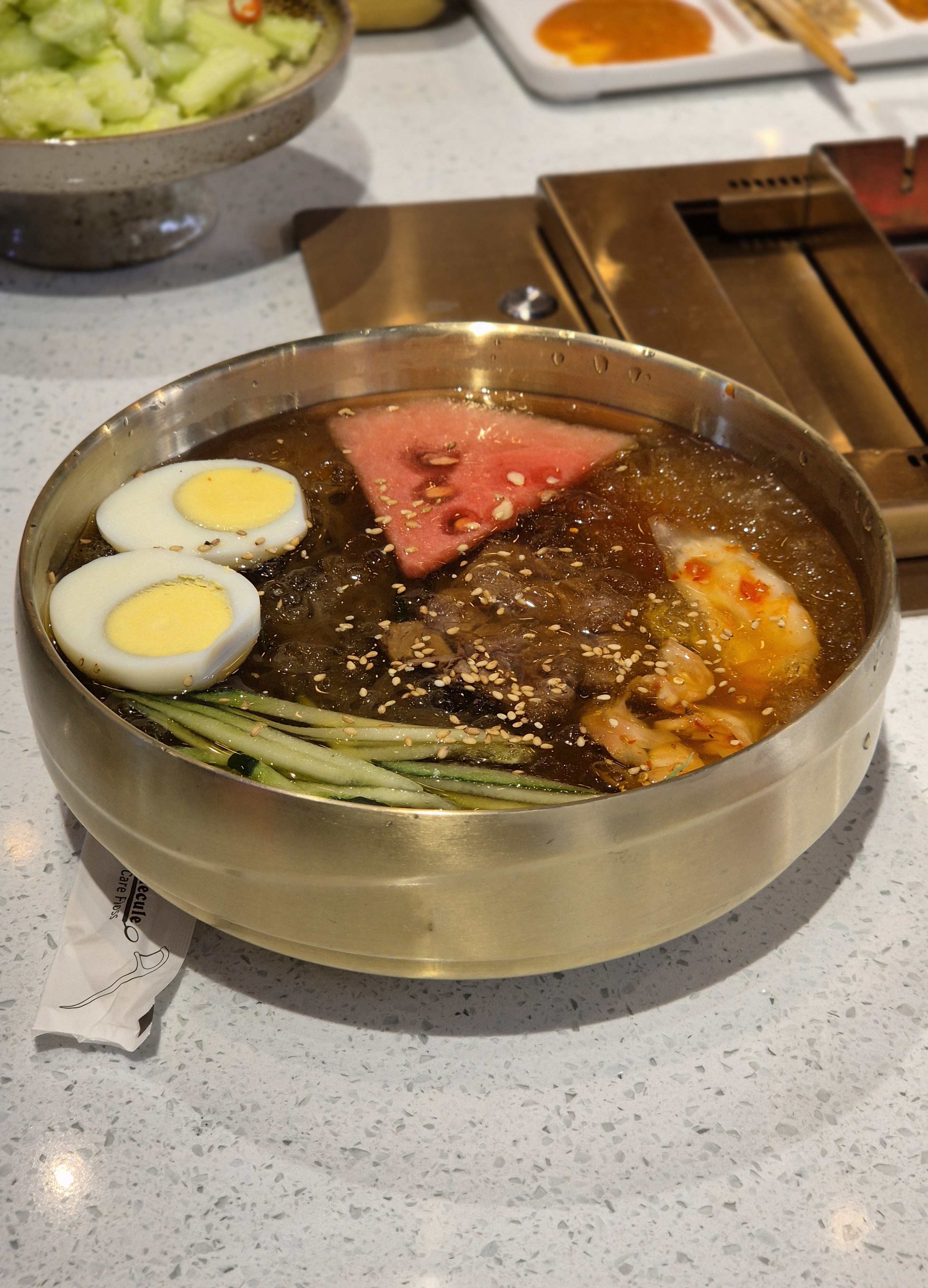 [Yum Yum BBQ]에서 가장 기억에 남는 건 의외로 [냉면]이었다. 처음엔 혼종 느낌 때문에 친구 추천을 반신반의하며 시켰는데, 같이 온 친구도 처음이었다면 절대 주문하지 않았을 거다. 하지만 한 입 먹어보니 친구에게 미안할 정도로 훌륭했다. [냉면]보다 살짝 달달한 맛이 있었지만, 고기와의 조합이 환상적이었다. 다음에 [Yum Yum BBQ]에 오면 1인 1[냉면]은 필수로 해야겠다고 다짐할 만큼 만족스러웠다. 특히 [냉면]과 찰떡궁합인 고기는 통통한 [Pork Skirt]인 [갈매기살]!